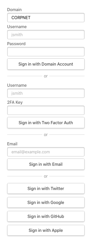 The Credentials provider allows you to handle signing in with arbitrary credentials, such as a username and password, domain, or two factor authentication or hardware device (e.g. YubiKey U2F / FIDO).